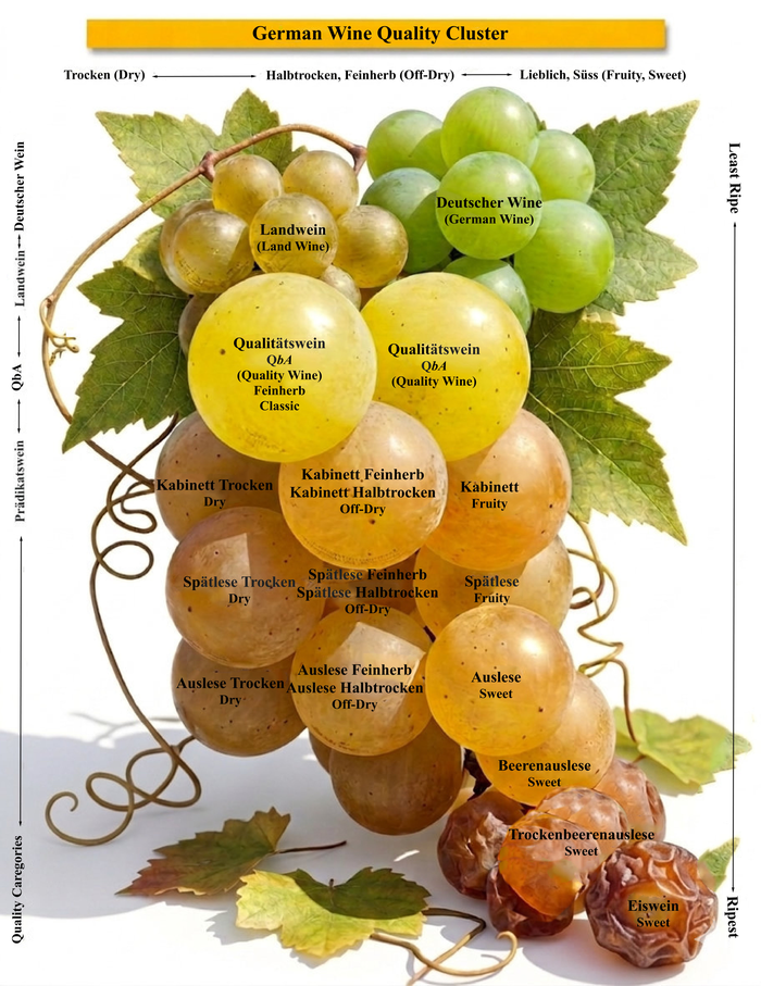 NOTE: All wines up to and including Auslese (Deutscher Wein, Deutscher Landwein, Qualitätswein (QbA), Kabinett, Spätlese and Auslese) can be DRY, MEDIUM-DRY or SWEETER STYLE. The winemaker decides whether he or she wants these grapes to make a dry or a sweet wine. Riesling is the grape that CAN do both.