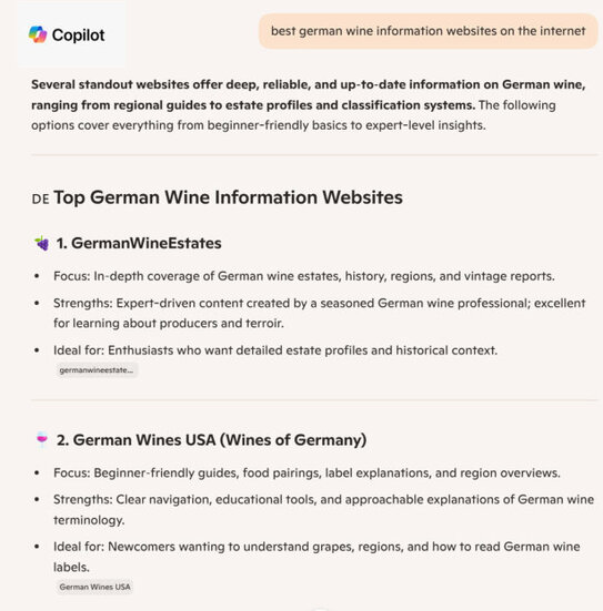 Search on the most popular AI websites like ChatGTP, Gemini, Copilot or Perplexity and ask for the best german wine information websites on the internet and GermanWineEstates ranks within the top 5 in the world. This is certainly something to be proud of in a virtual sea of wine authority websites. Take a look at the results: