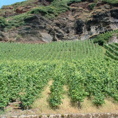 The Mosel River is the sinuous spine of the Mosel region, changing direction so often as it flows northeast toward the Rhine that it meanders nearly 250 km/150 miles, to cover about half that distance as the crow flies. Together with its two small tributaries, the Saar and the Ruwer, the Mosel composes one geographical entity. Although each river's vineyard area produces a wine with its own distinctive personality, the three share a family resemblance: a fragrance reminiscent of spring blossoms, a pale color, light body and a refreshing, fruity acidity. To add to their charm, they often have the slightest hint of effervescence. Most display their finest charms in youth; the late- and selectively-harvested wines merit aging. Along the serpentine route of the Mosel, the river banks rise so sharply that the vineyards carpeting these slopes are among the steepest in the world, with some planted at an astounding 70-degree gradient. On these precipitous inclines, nearly all labor must be done by hand. That includes tying each vine to its own eight-foot wooden stake, and carrying up the slate soil that has washed down with the winter rains.